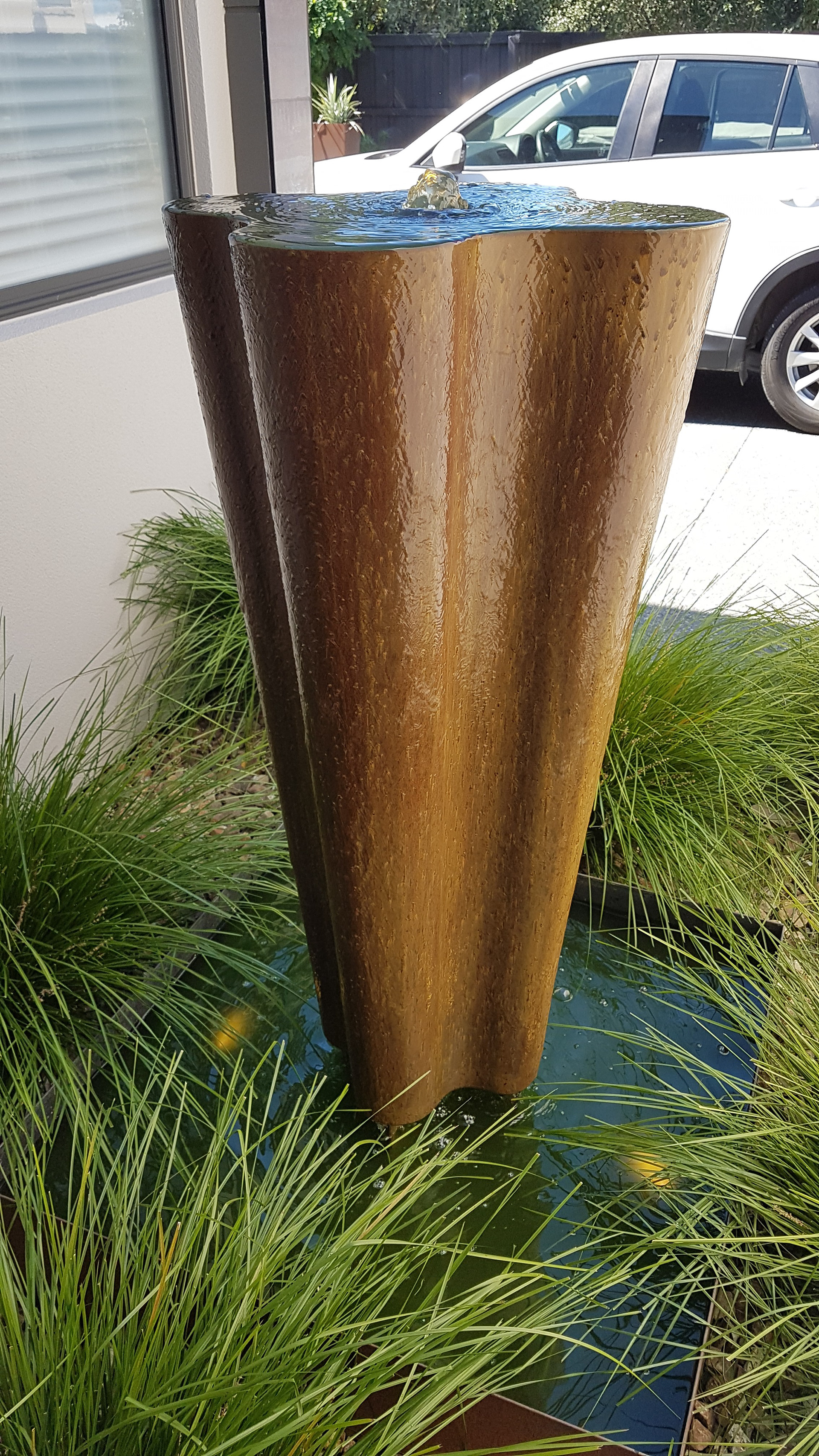 Six clover shaped vessels of differing heights combine to create eight horizontal surfaces of reflective water. Water wells from the six vessels, spilling from level to level and shimmering down the entire outer surface of the sculpture.