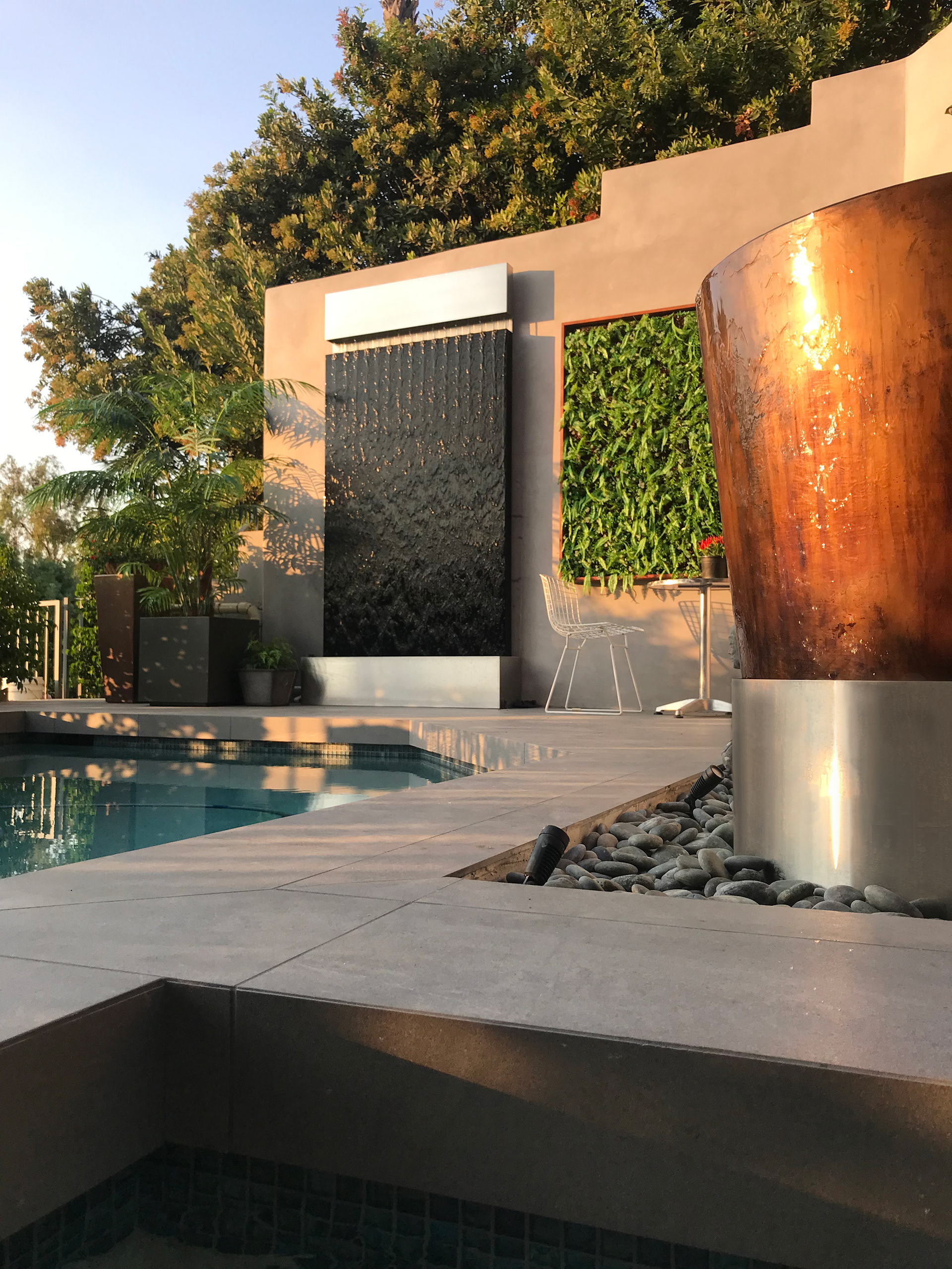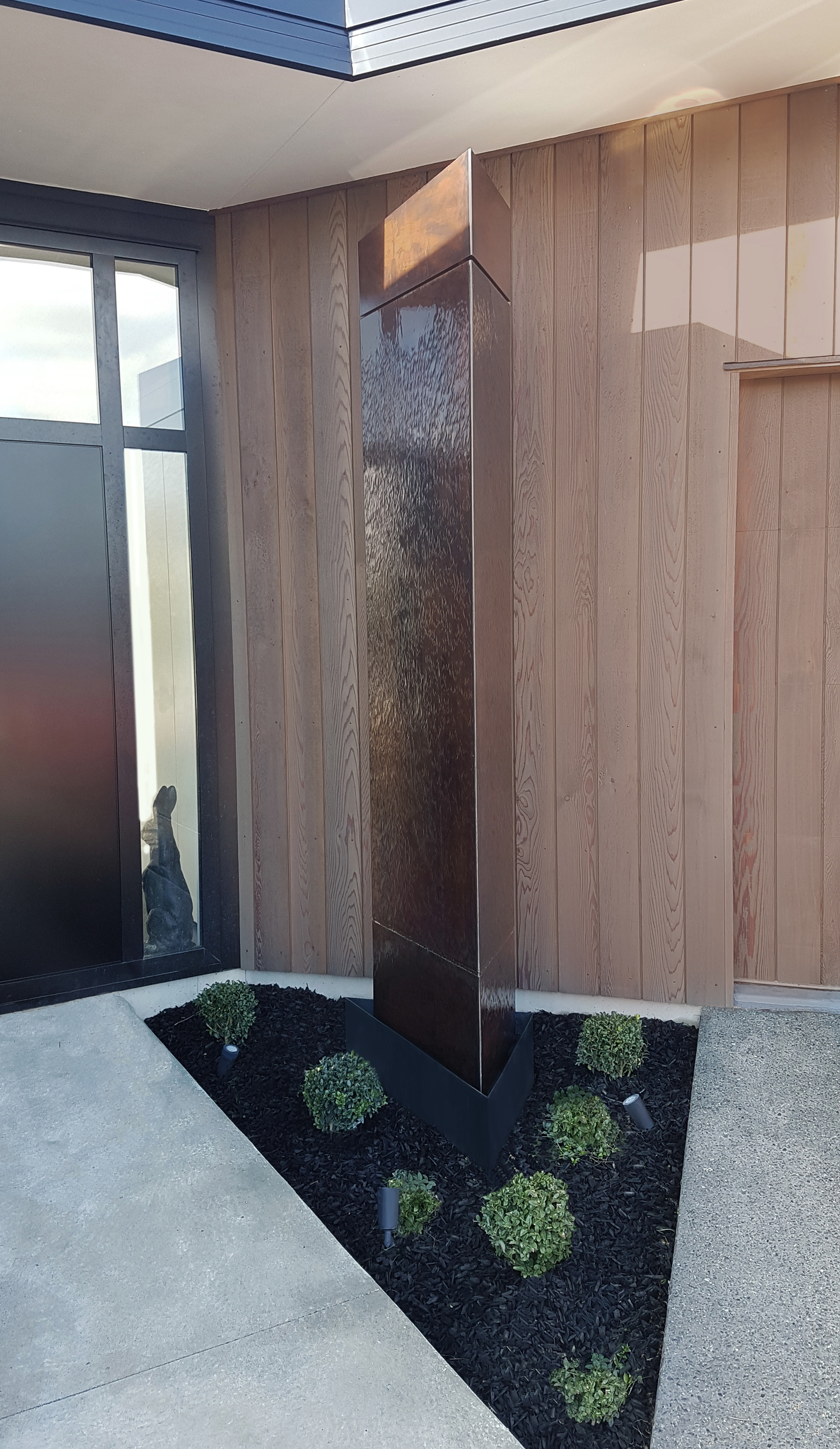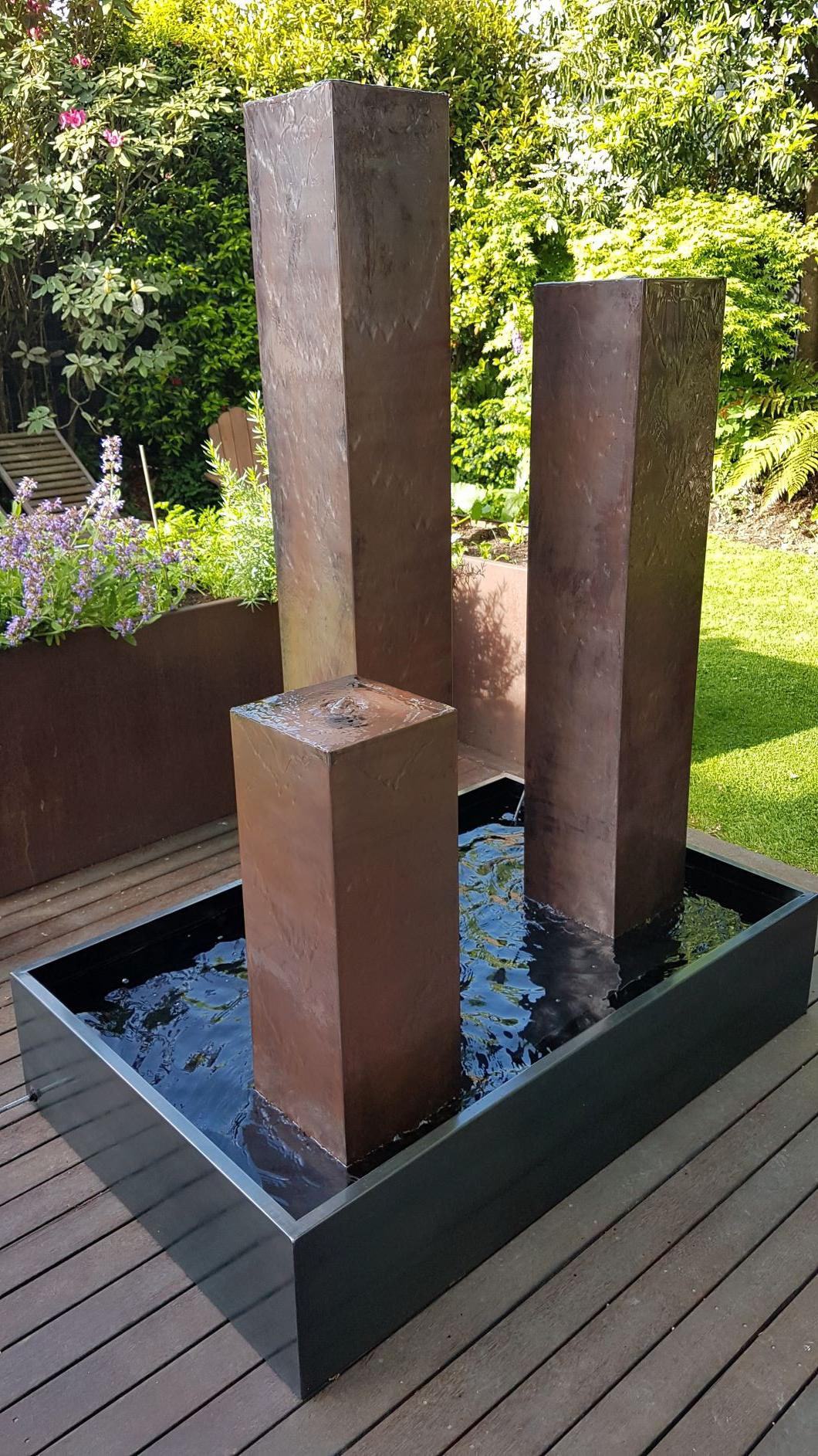 Bronzed copper columns in a gunmetal patinaed stainless pond. Refer to Copper portfolio for further examples.