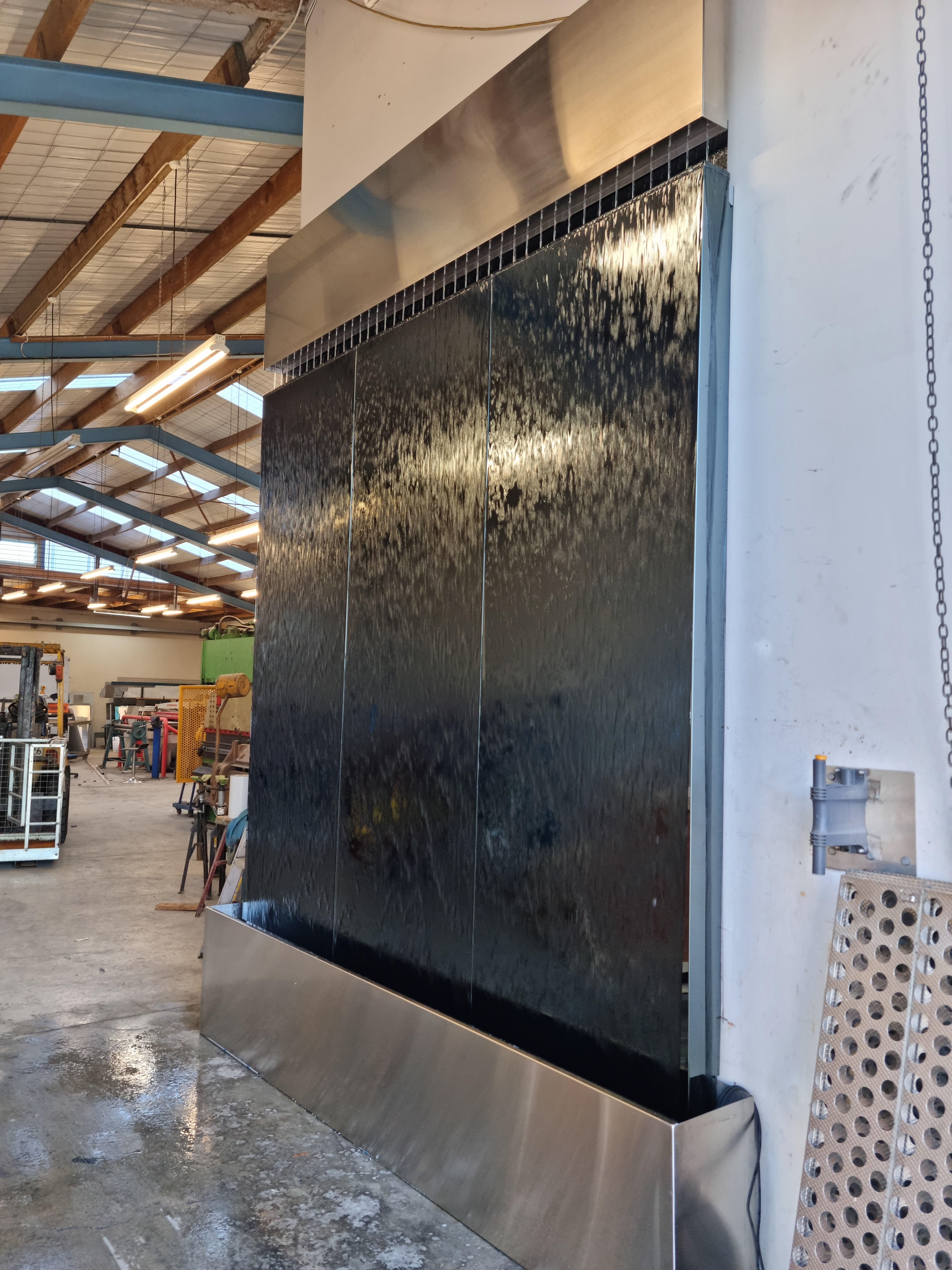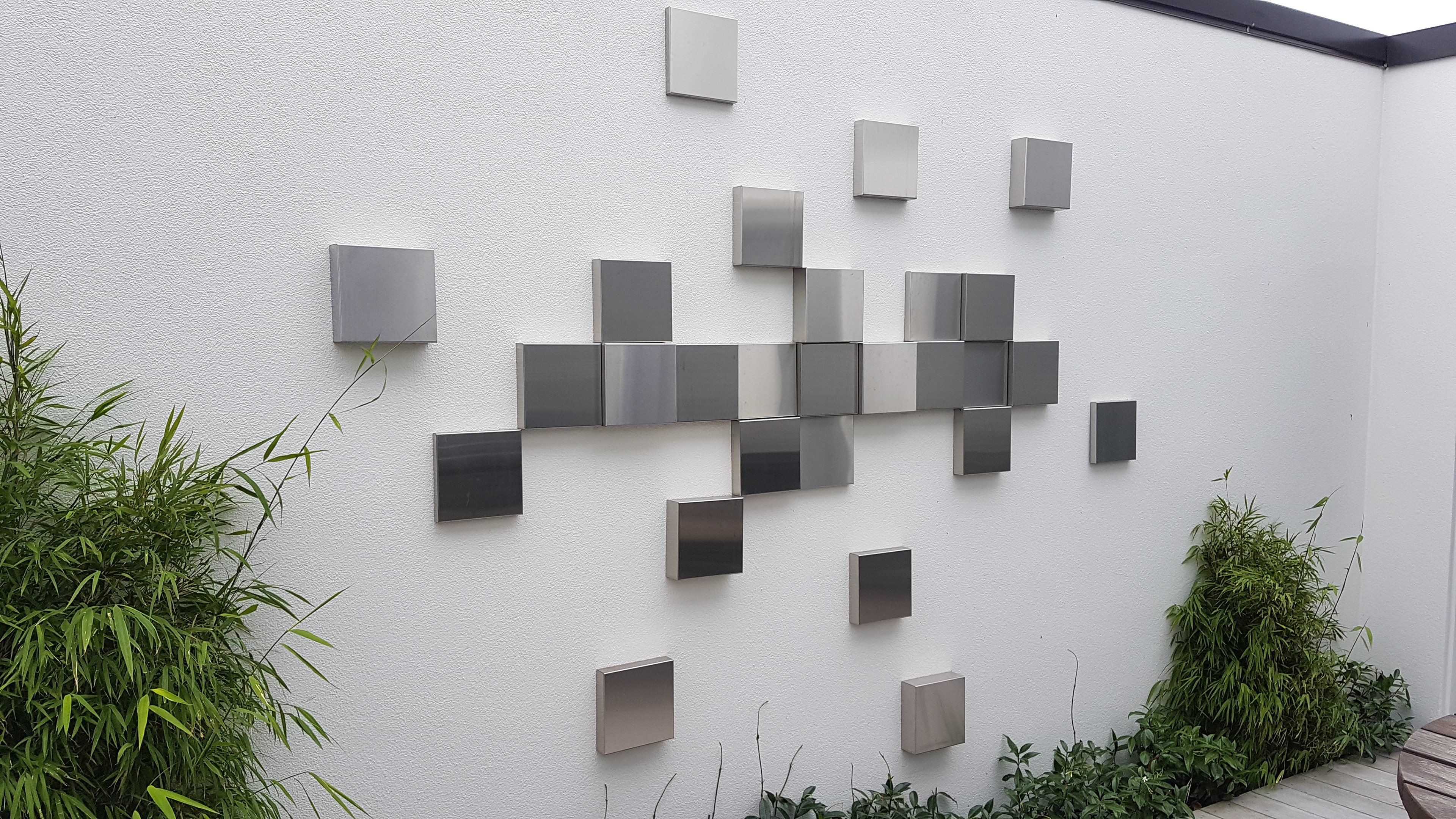 A mirror stainless water wall sculpture in the foreground with a stainless wall sculptural in the background. Refer to Stainless Steel portfolio and Wall Art and Architectural Elements portfolio for further examples.