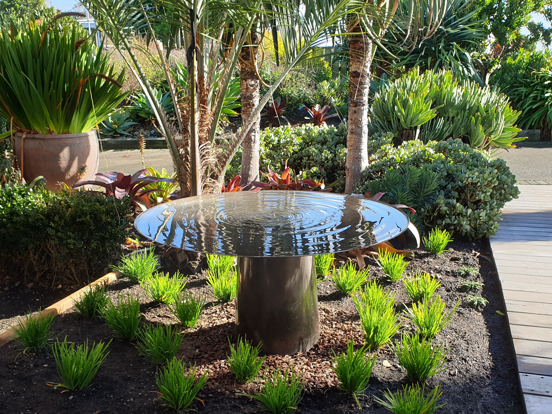 Wāhi Whakanoa - a custom 1050mm dia. stainless steel Rippledish on a rimu bench. Refer to 'Rippledish' page for further details.