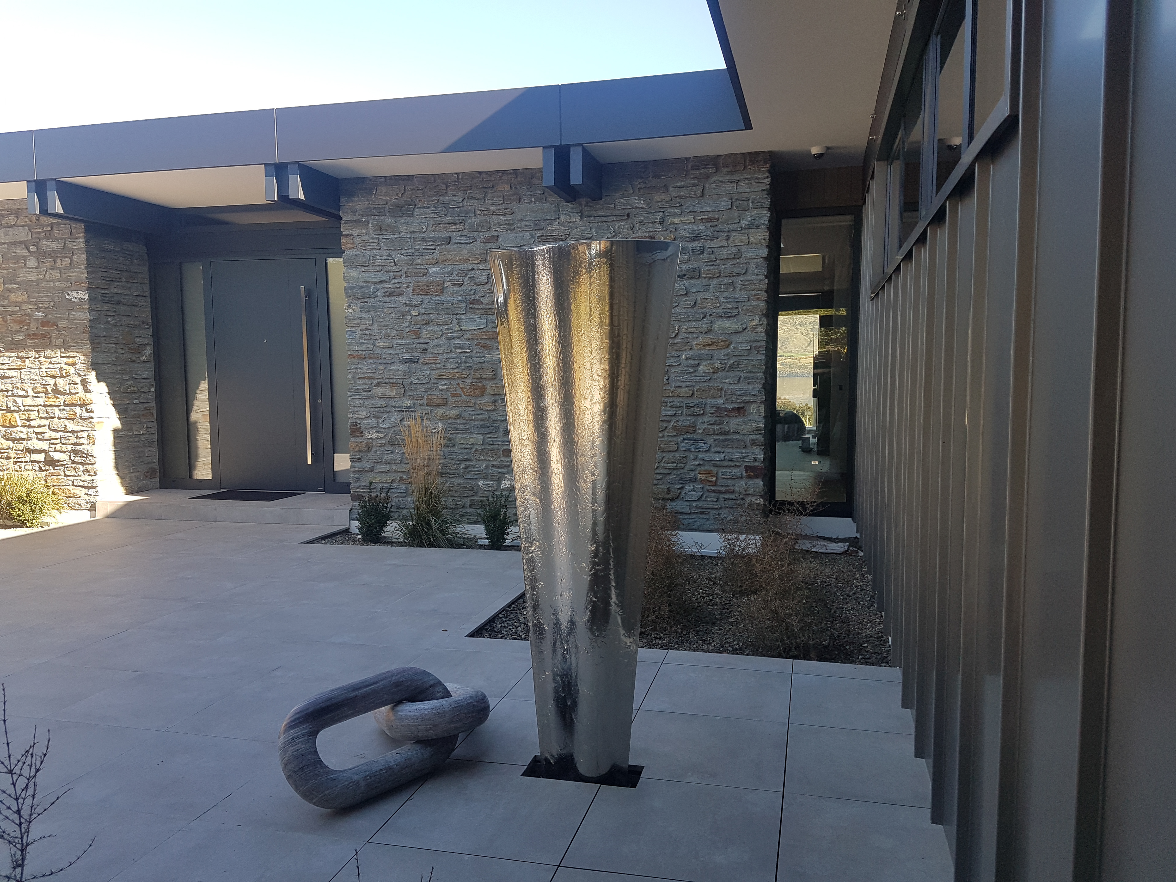 Mirror stainless steel Schwarzkopf water sculpture with bluestone pavers. Refer to Stainless Steel portfolio for further examples.