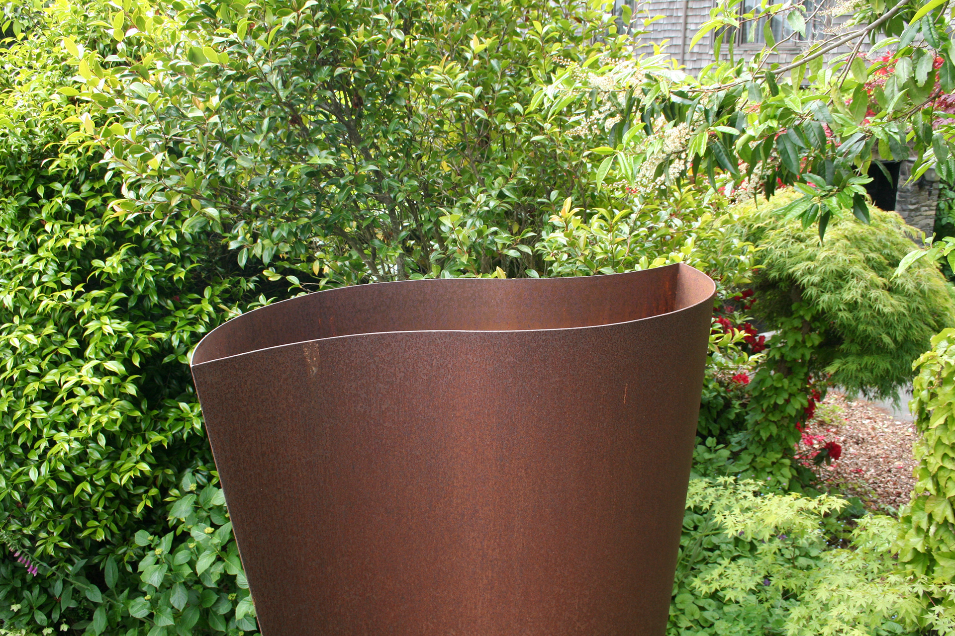 This large sculptural vessel is formed from rugged corten steel. 2360 mm tall.